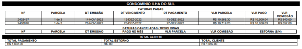 Cód. Do vendedor (Loja) seguindo pela razão social da mesma e período que compreende a comissão. Em seguida aparece o nome do cliente, com as informações: