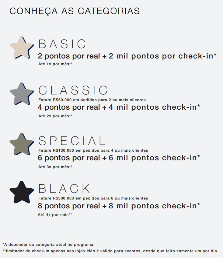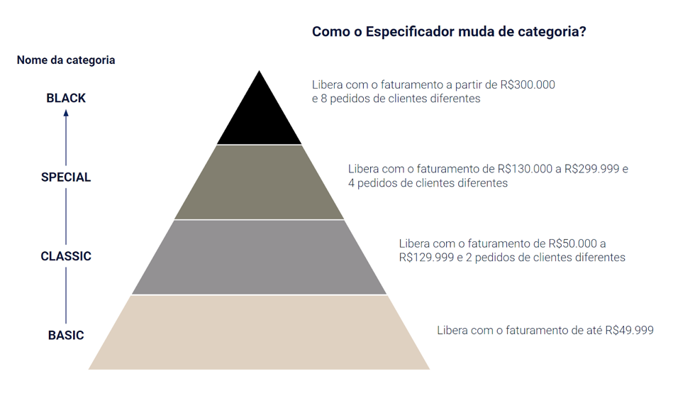 Para ocorrer o upgrade para as demais categorias, em direção ao topo, é necessário que o profissional tenha especificações/pedidos faturados e a frequência mínima (número de clientes diferentes) conforme cada categoria.