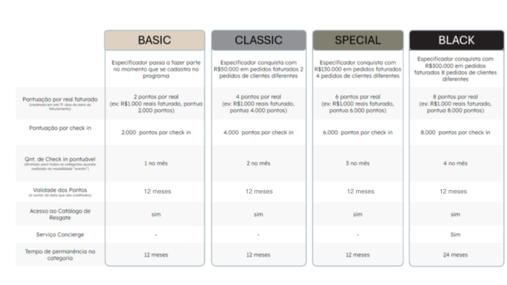 O Especificador pode pontuar por Pedido Faturado e Check-in em Loja ou eventos. Confira as regras de pontuação e avanço de categoria: