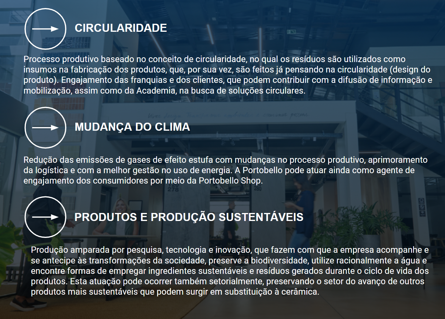 A sustentabilidade sempre foi tema central para a Portobello. À medida que a companhia evoluiu em inovação para o design de produtos, avançavam também as práticas para o melhor aproveitamento de matérias-primas, gestão de água e resíduos, eficiência energética e relacionamento com a cadeia de valor. Clique no ícone abaixo para expandir o texto:
