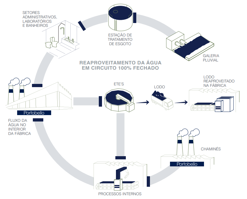 A água é utilizada em processos industriais e administrativos na Portobello. No complexo de Tijucas, as seis fábricas possuem hidrômetro individualizado e metas de consumo. Um circuito 100% fechado garante o tratamento e a reutilização de toda a água industrial em parte do processo. O volume que precisa ser reposto (em decorrência da evaporação) e o insumo necessário para a etapa de esmaltação ou para o consumo das áreas administrativas é captado de fontes fluviais (30%) e subterrâneas (70%), localizadas em terreno próprio. O consumo está alinhado com o volume outorgado de captação de água doce e com as diretrizes da bacia hidrográfica onde a unidade se localiza.