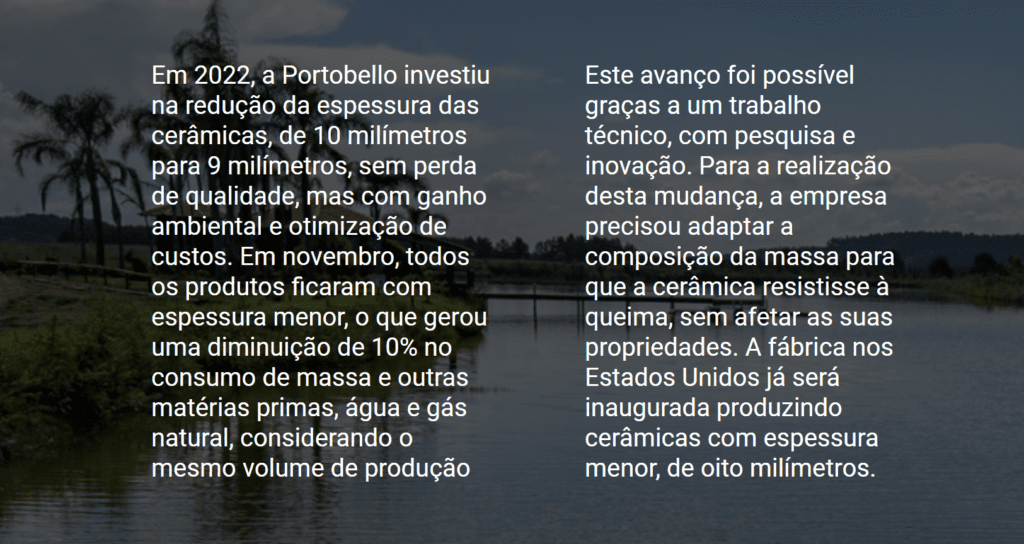 A Portobello é a maior fabricante de cerâmicas do Brasil e pioneira na produção de lastras, peças maiores que substituem outros materiais com impacto ambiental mais significativo, como madeira e pedras. A principal matéria-prima da cerâmica é a própria terra, retirada de camadas não profundas. Além disso, a cerâmica pode ser feita também com resíduos da própria indústria e de outros setores.