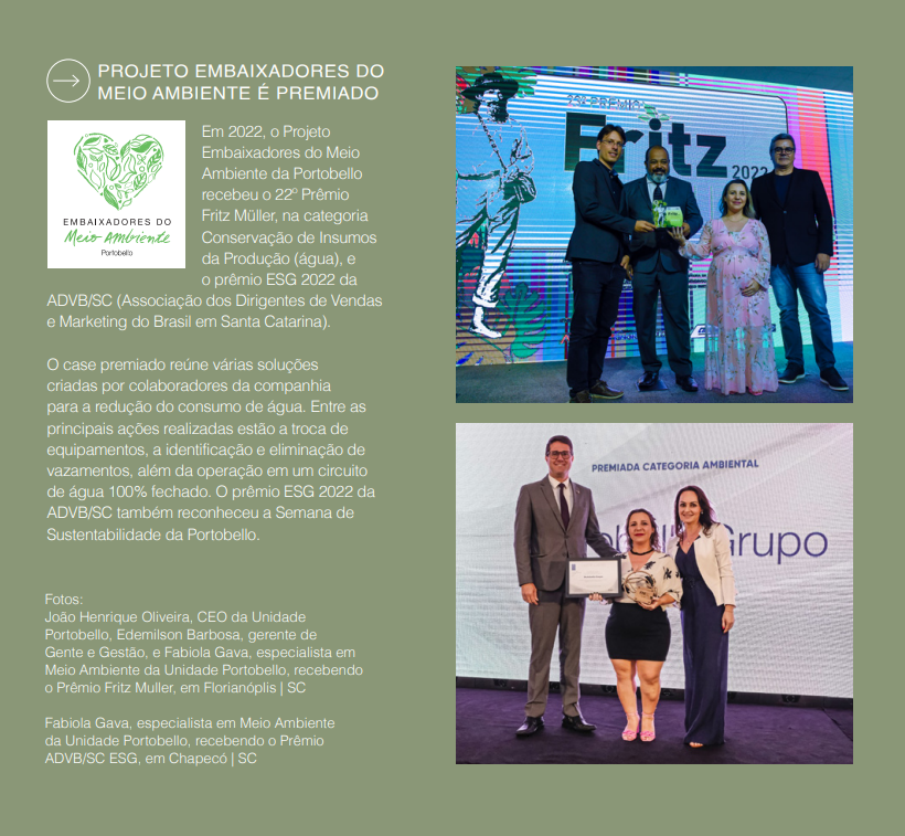 O projeto Embaixadores do Meio Ambiente recebeu o 22º Prêmio Fritz Müller, na categoria Conservação de Insumos da Produção (água), e o prêmio ESG 2022 da ADVB/SC (Associação dos Dirigentes de Vendas e Marketing do Brasil em Santa Catarina). Clique abaixo para saber mais.