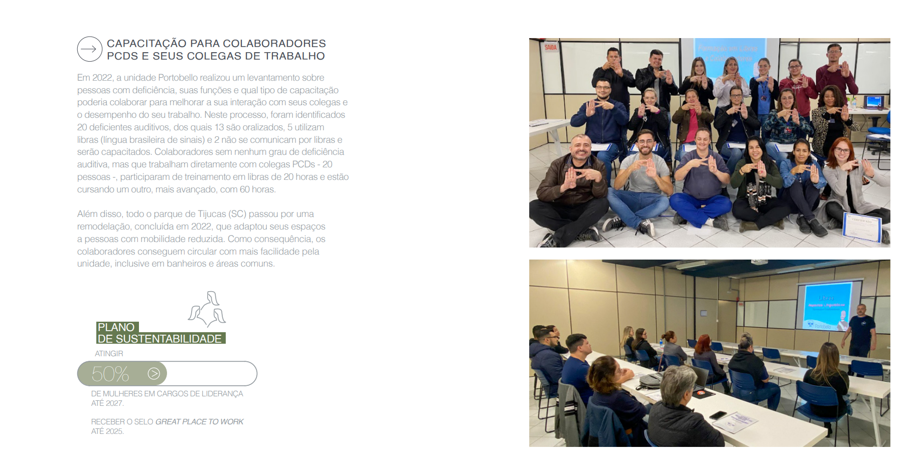 Em 2022, a unidade Portobello realizou um levantamento sobre pessoas com deficiência, suas funções e qual tipo de capacitação poderia colaborar para melhorar a sua interação com seus colegas e o desempenho do seu trabalho.