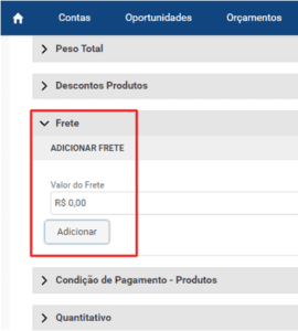 O valor do serviço de medição deve ser incluído no orçamento no Salesforce, no campo frete.