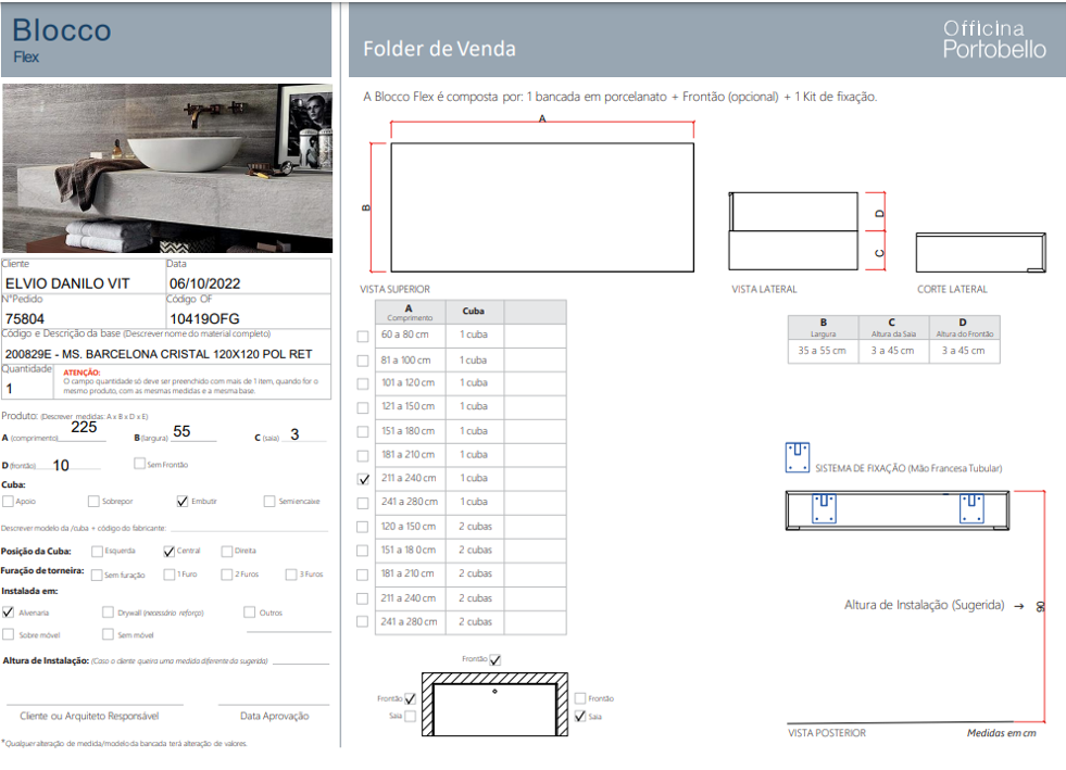 Quando a medição é feita pela Officina Portobello, o agendamento, medição, elaboração de projeto executivo e instalação são feitos pela equipe Officina. Os serviços de agendamento, medição e instalação são feitos em contato direto com o cliente após o fechamento da venda. Verifique, com o seu Gerente, se o serviço de medição está disponível na sua loja. |