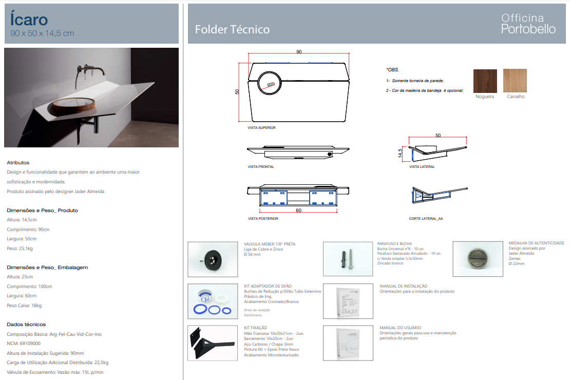 Cada Item Padrão do Portfólio Officina possui o seu Folder Técnico. Trata-se de um arquivo em formato PDF com informações técnicas, como: dimensões, peso, acessórios que acompanham o produto e instruções de instalação.
