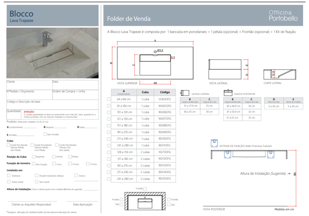 Utilize o Folder de Venda para consultar as especificações técnicas do produto e fazer anotações de medidas para auxiliar na especificação.