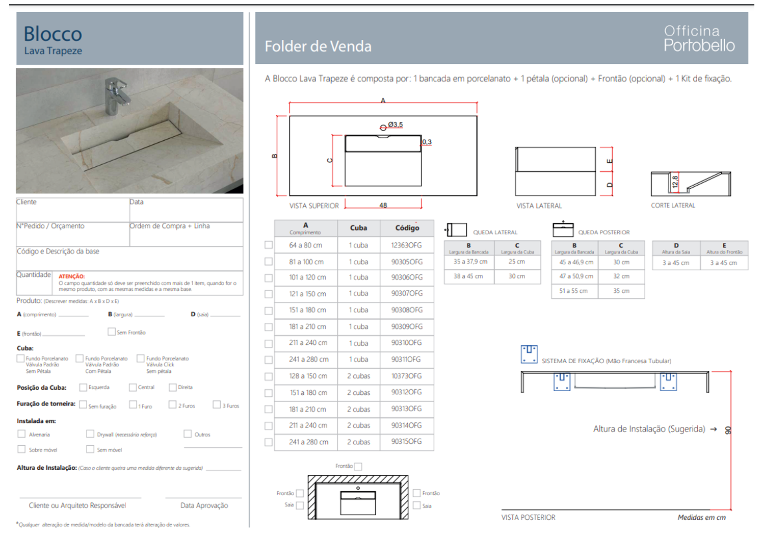 Cada Item Flexível do Portfólio Officina possui o seu Folder de Venda. Trata-se de um arquivo em formato PDF que orienta, no momento da especificação, as possibilidades de parametrização do produto. O Consultor deve usar o Folder de Vendas para fazer anotações de medida e consultar especificações técnicas.