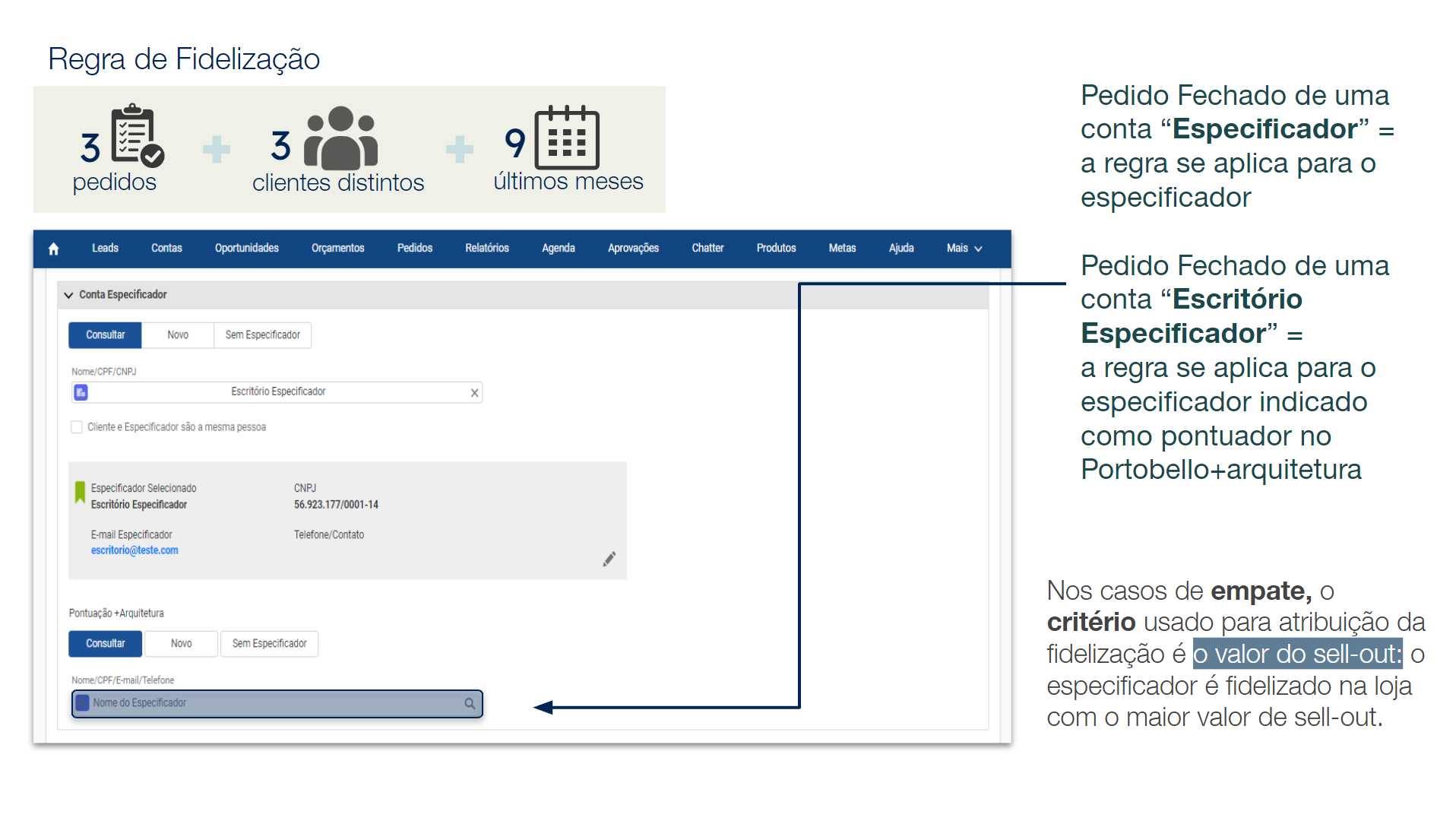 - No caso do profissional ter especificado a mesma quantidade de pedidos em duas lojas, a loja com o maior valor gasto no período é que terá o Especificador/a fidelizado/a.
